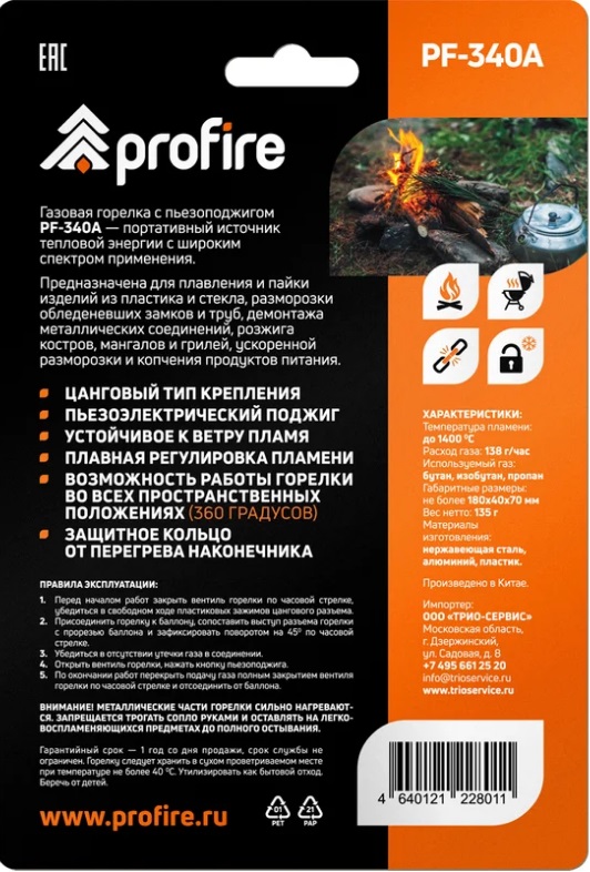 PROFIRE Горелка газовая PF-340a - портативный источник тепловой энергии с широким спектром применения. Предназначена для плавления и пайки изделий из пластика и стекла, разморозки обледеневших замков и труб, демонтажа металлических соединений, розжига костров, мангалов и грилей, ускоренной разморозки и копчения продуктов питания, лучшее приспособление для розжига тандыра, камина, незаменима на охоте, рыбалке.