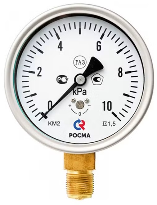 Тип КМ (КМВ). Манометр для измерения низких давлений газов (напоромер) применяется для измерения давления сухих, газообразных сред, неагрессивных к медным сплавам.