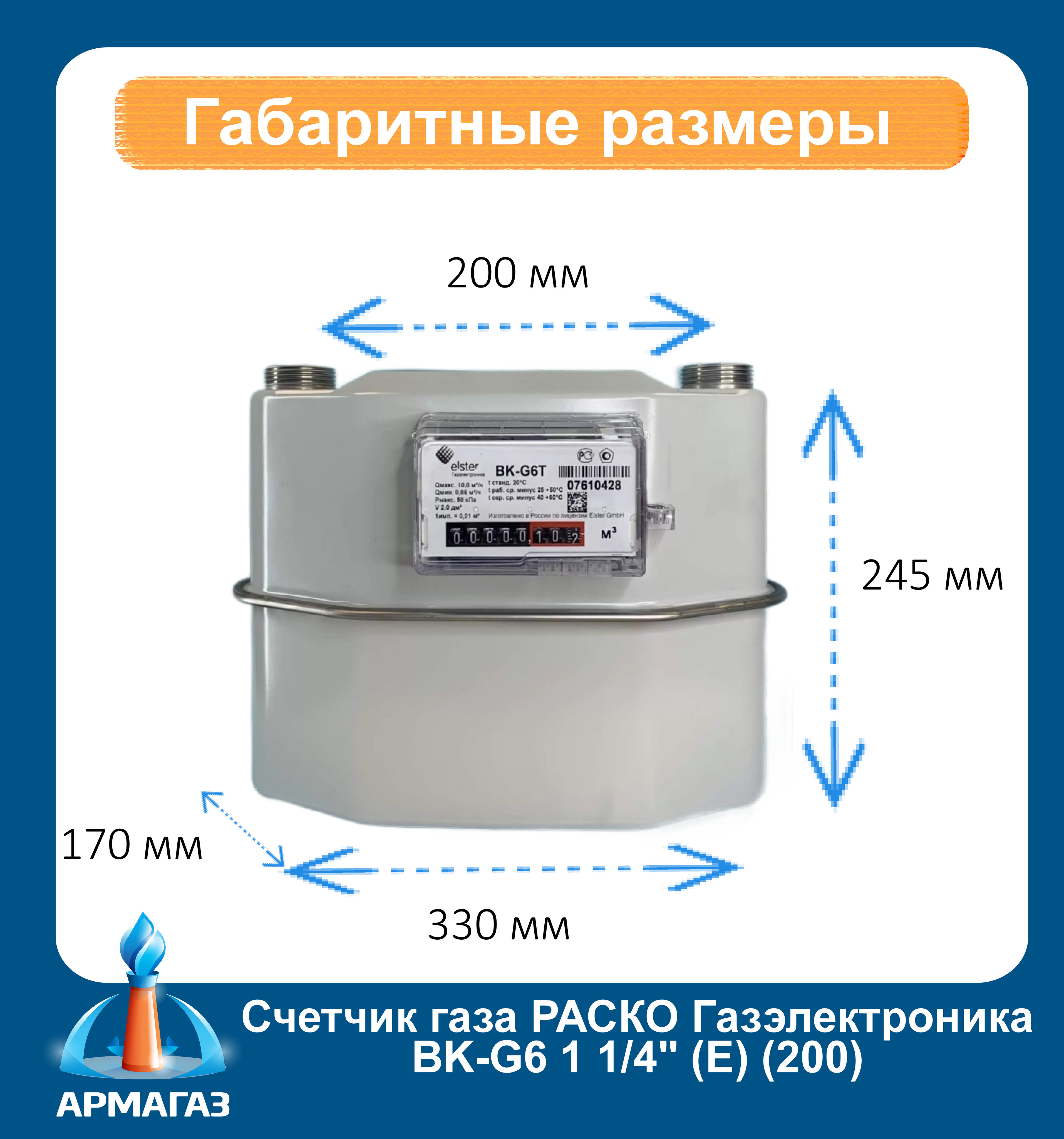Счётчик газа диафрагменный РАСКО Газэлектроника BK-G6 1 1/4"— это современные коммунальные газоизмерительные приборы, предназначен для коммерческого учёта количества потребляемого газа. Измеряемая среда: природный газ, пропан, бутан, инертные газы и другие неагрессивные, неоднородные по химическому составу газы.