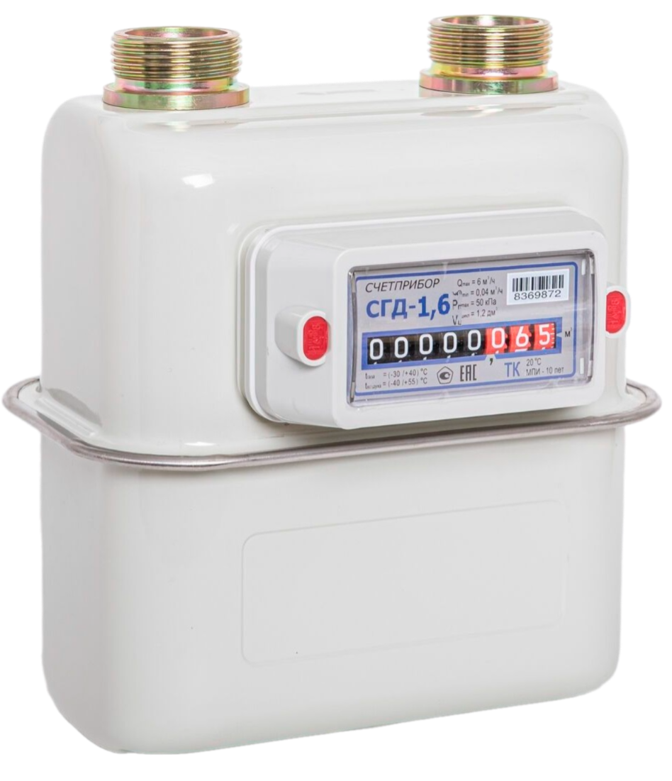 Счётчик газа диафрагменный СГД G1,6 — это современные коммунальные газоизмерительные приборы, выпускаемые заводом «Счётприбор» г. Орёл, предназначен для коммерческого учёта количества потребляемого газа. Измеряемая среда: природный газ, пропан, бутан, инертные газы и другие неагрессивные, неоднородные по химическому составу газы.