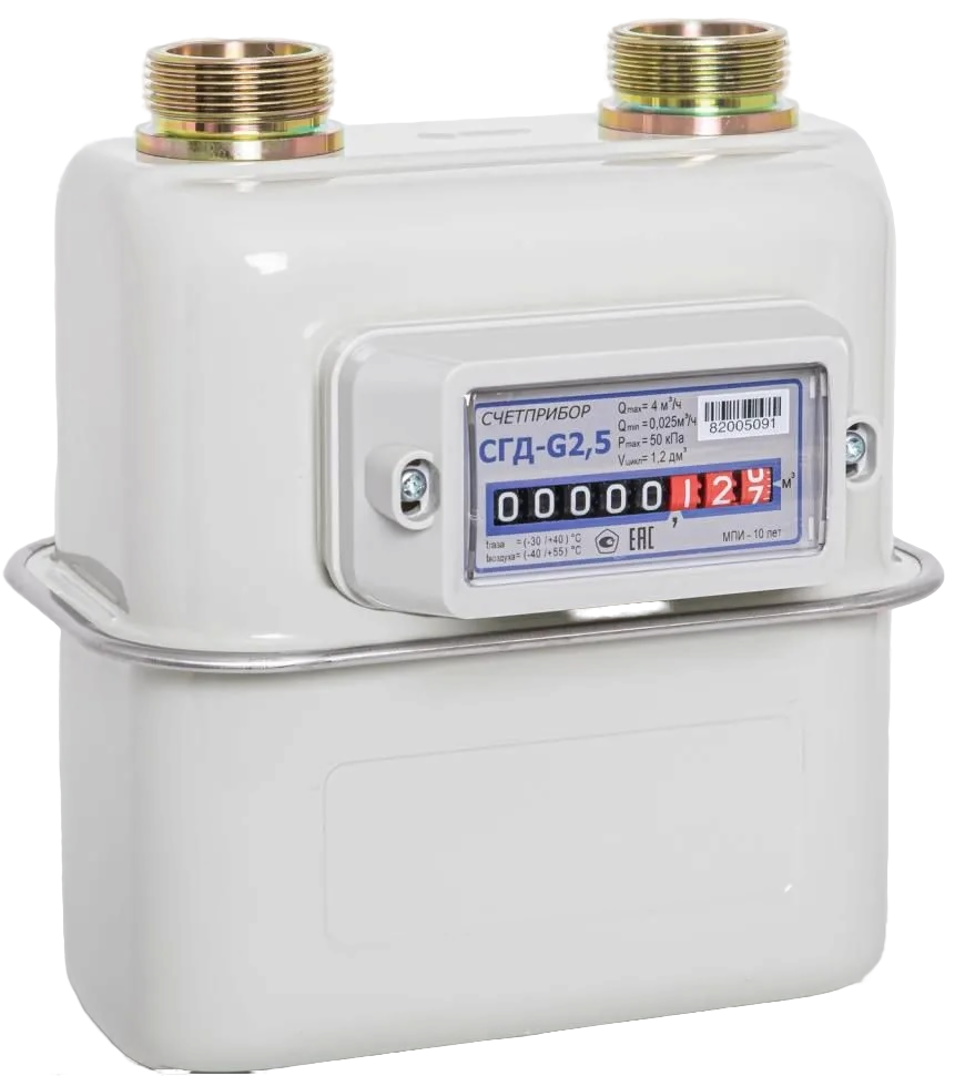 Счётчик газа диафрагменный СГД G2,5 — это современные коммунальные газоизмерительные приборы, выпускаемые заводом «Счётприбор» г. Орёл, предназначен для коммерческого учёта количества потребляемого газа. Измеряемая среда: природный газ, пропан, бутан, инертные газы и другие неагрессивные, неоднородные по химическому составу газы.