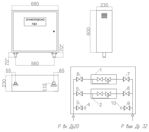 Газораспределительный пункт шкафной ГРПШ-ОХТА- максимальная пропускная способность регулятора) предназначен для редуцирования давления газа с высокого или среднего на низкое и автоматического поддержания выходного давления на заданном уровне, прекращения подачи газа при аварийном понижении выходного давления сверх допустимых заданных значений.